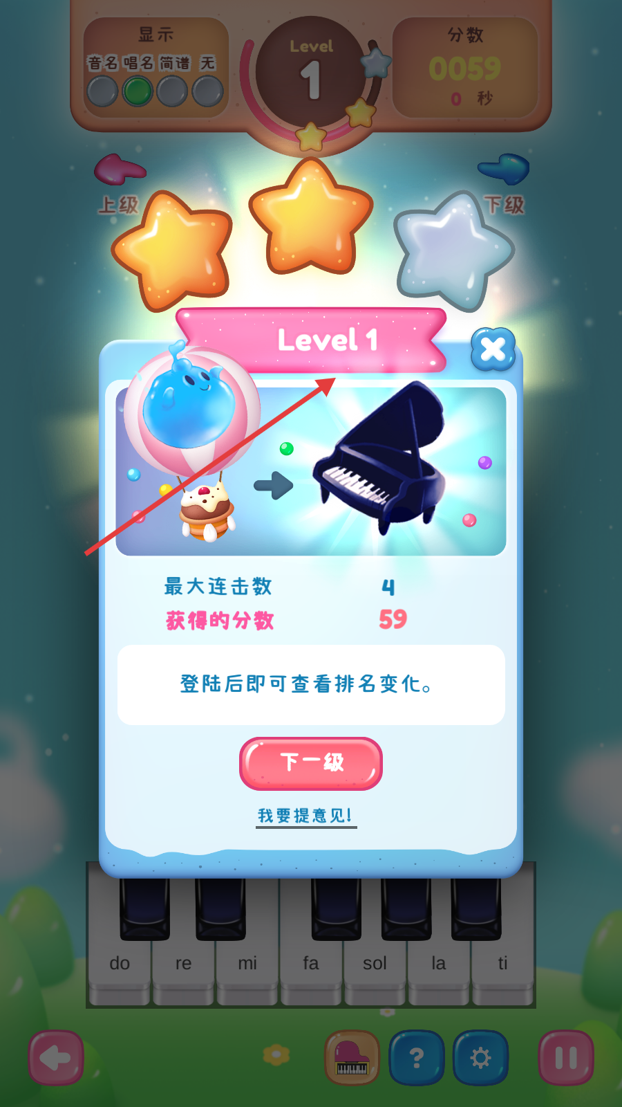 4、完成Level 1练习后,可查看最大连击数、获得分数等信息,点击【下一级】可继续进行更高等级的练习。