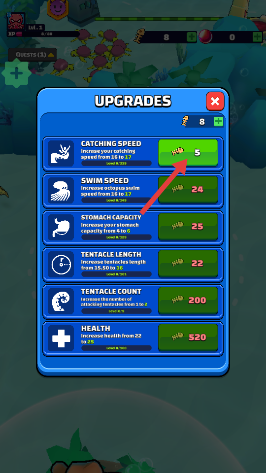 4、升级【CATCHING-SPEED】等属性,提升章鱼的捕捉速度等能力。