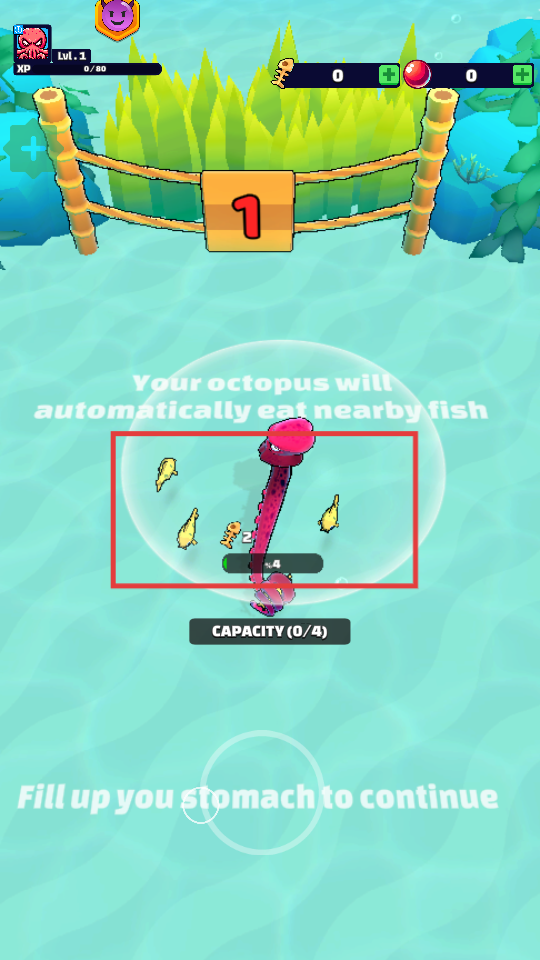 3、让章鱼自动吃掉附近的鱼,填满胃部,推进游戏进程。
