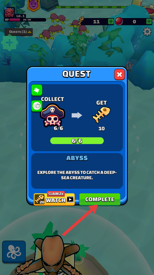 2、完成任务,点击【COMPLETE】,获取鱼骨奖励,提升角色实力,推进游戏进程。