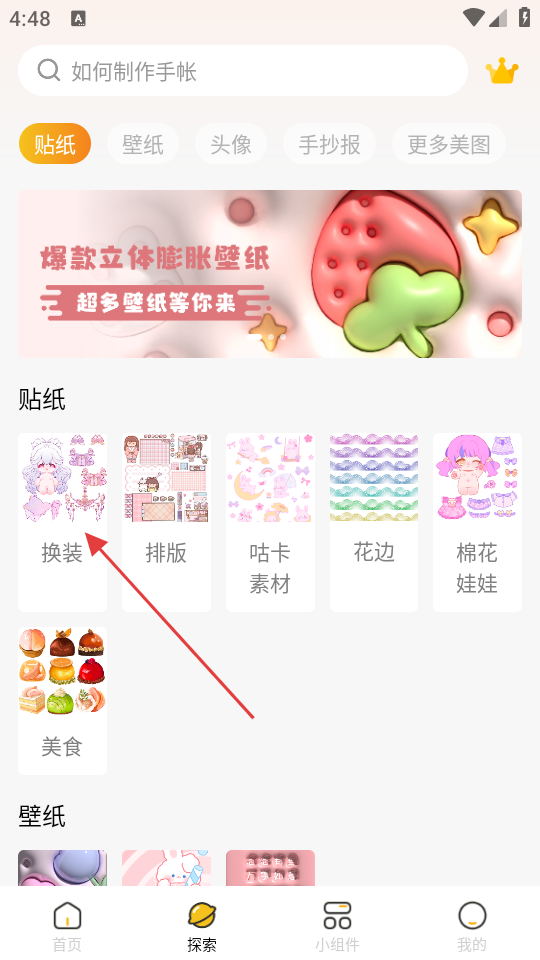 3、在探索页面,可选择【贴纸】分类下的【换装】选项,进入换装贴纸专区。
