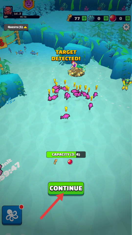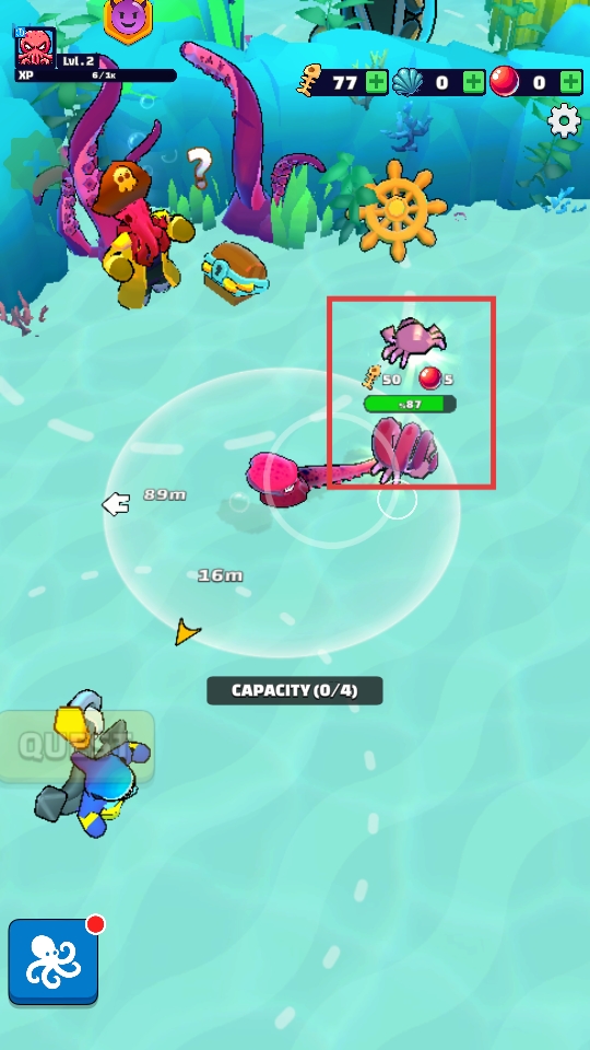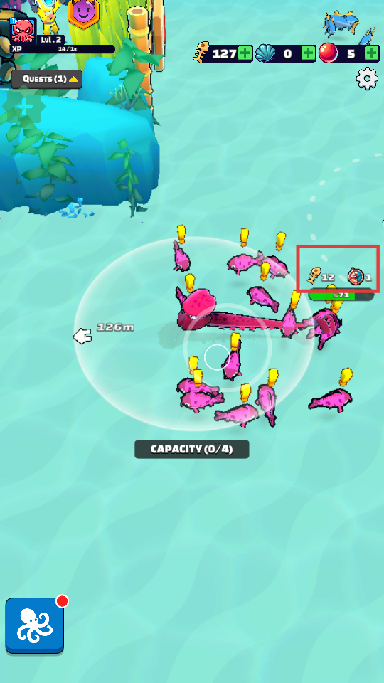 3、捕捉粉色鱼类,获取骨头和红球资源,增强章鱼的成长资源。