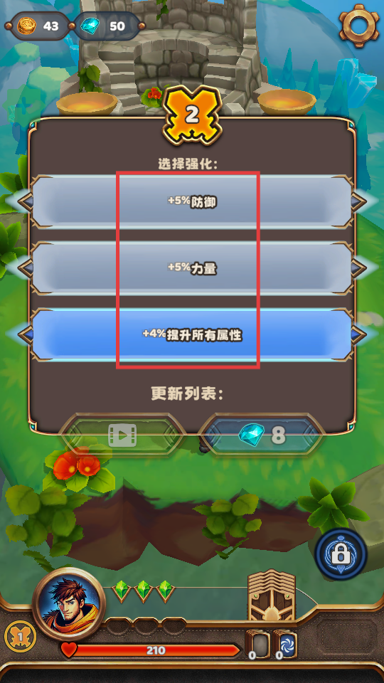 4、选择强化属性,如【+5%防御】【+5%力量】等,增强角色能力。