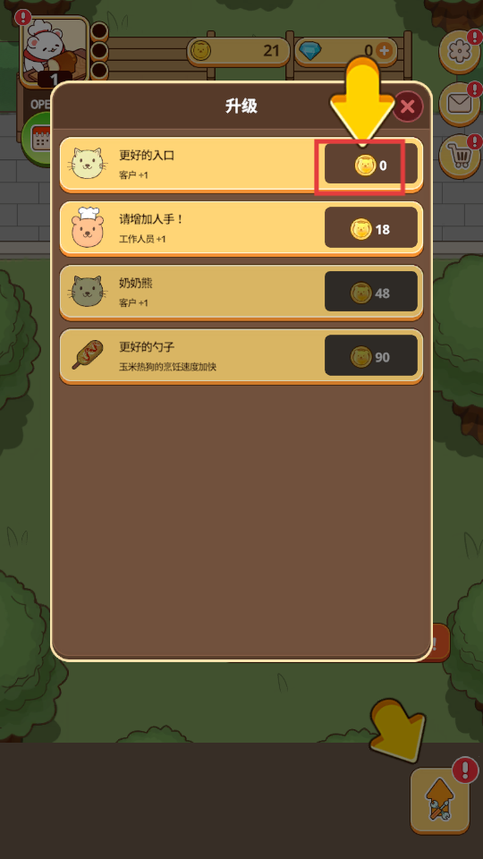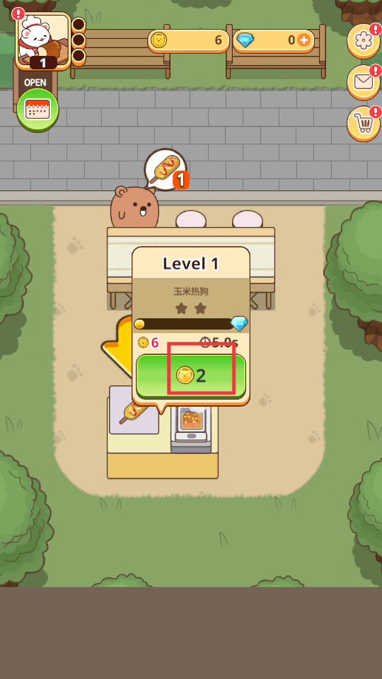 3、升级玉米热狗,满足顾客需求,获取金币,提升店铺等级。