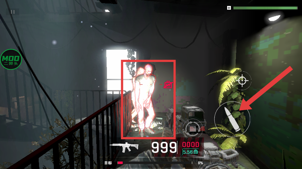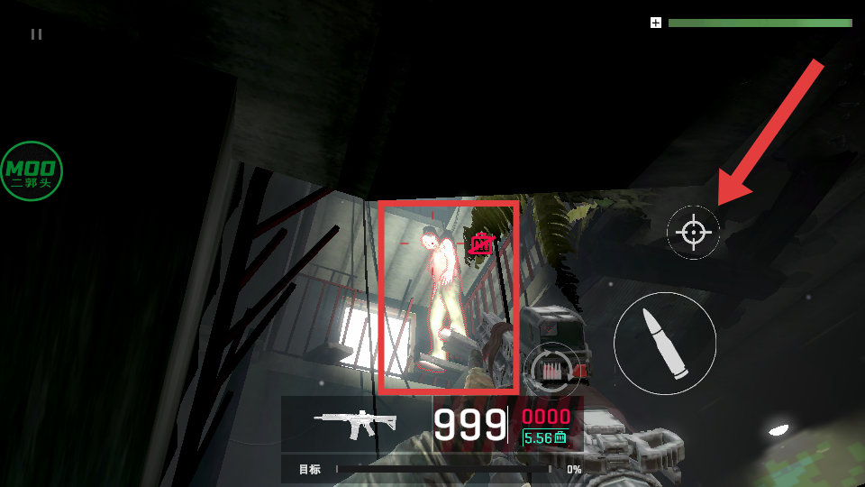 1、瞄准高处的僵尸,点击瞄准按钮锁定目标,准备发起攻击。