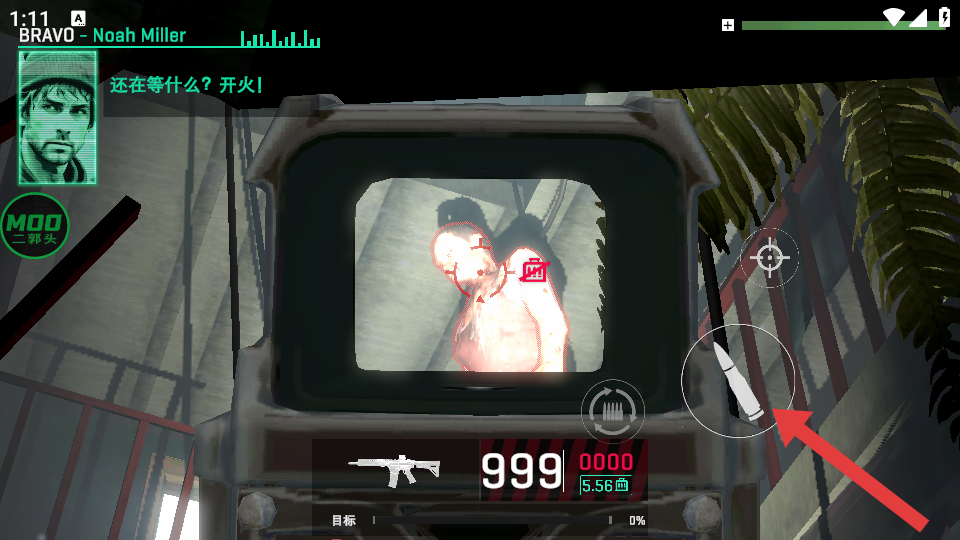 2、根据队友提示“还在等什么?开火!”,点击射击按钮消灭瞄准的僵尸。