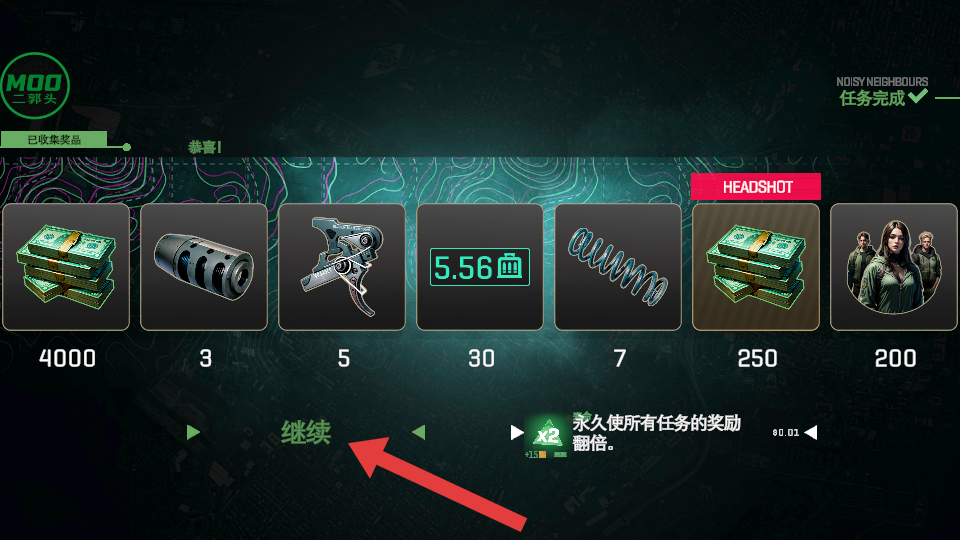 4、任务完成后,获取金钱、道具等奖励,点击【继续】挑战后续任务。