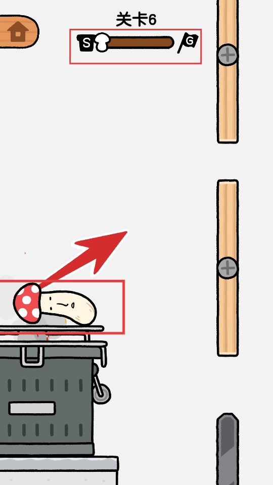 2、在【关卡6】中,操控蘑菇从【S】点出发,利用场景里的平台与木棍,向【G】点方向移动,注意滑动或点击的节奏。