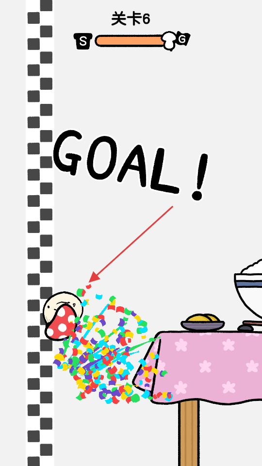 3、在【关卡6】抵达【GOAL】区域即通关,需合理控制蘑菇移动方向与力度,借助场景道具顺利到达终点。
