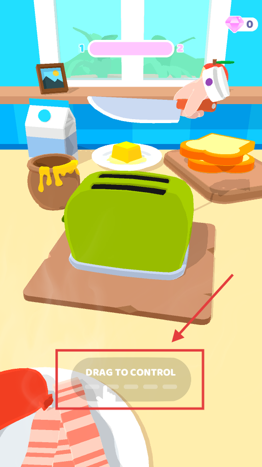1、依据【DRAG-TO-CONTROL】提示,拖拽控制切割角度与力度,专注目标,避开警告物品。