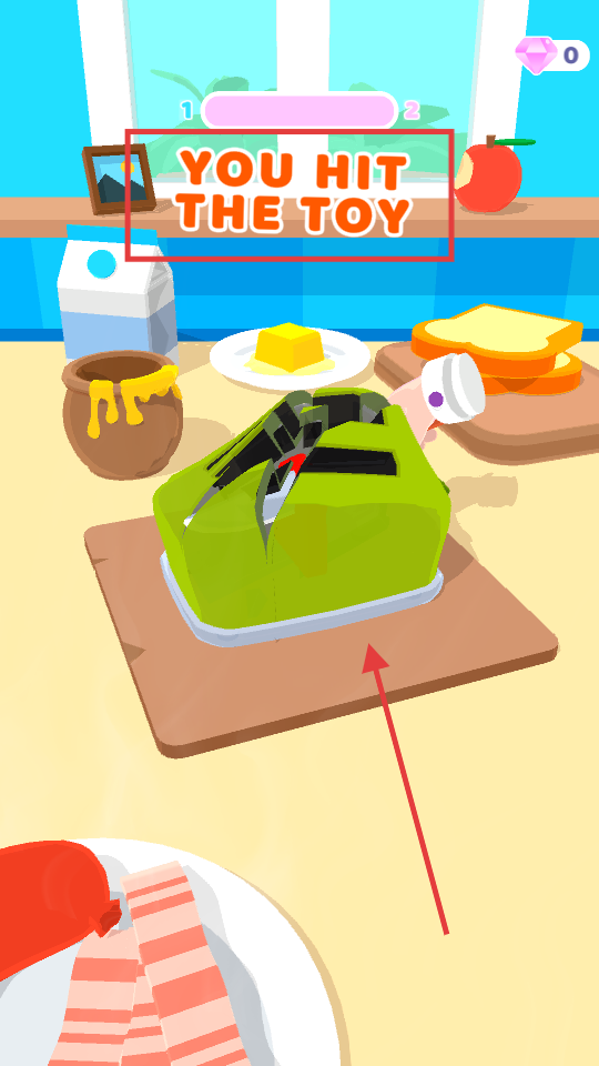 2、切到【TOY】触发【YOU-HIT-THE-TOY】,需调整切割角度力度,精准判断避开警告物品。