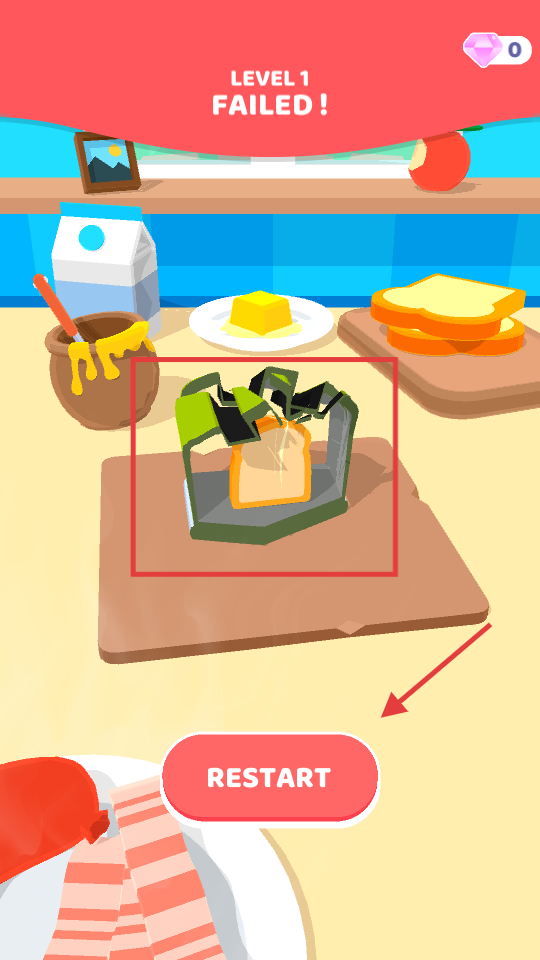 3、关卡失败点击【RESTART】重启,重新规划切割路径,避开警告物品确保切割成功。