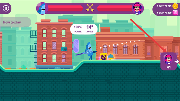 1、进入对战关卡后,查看界面显示的力度和角度参数,瞄准右侧敌方角色准备攻击。