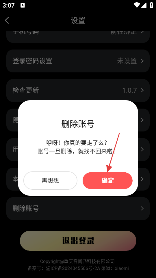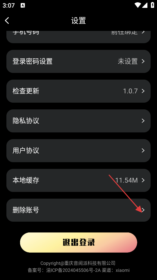 3、在设置界面,点击【删除账号】选项,可弹出删除确认框。