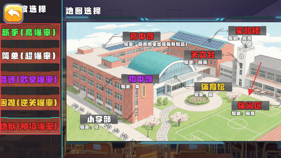 2、地图选择时,新手阶段选【新手-(高爆率)】区域,想快速积累物资可优先探索【休闲区】,其物资极高。
