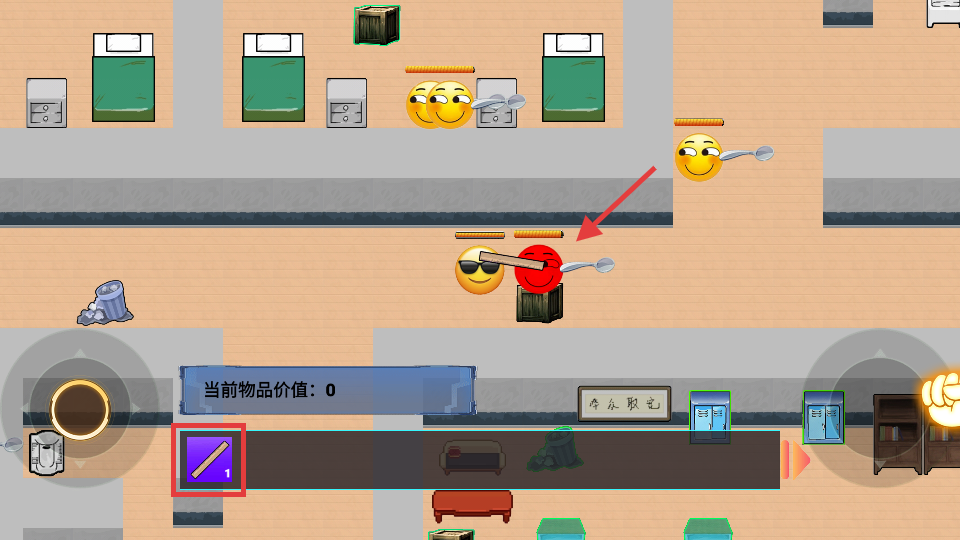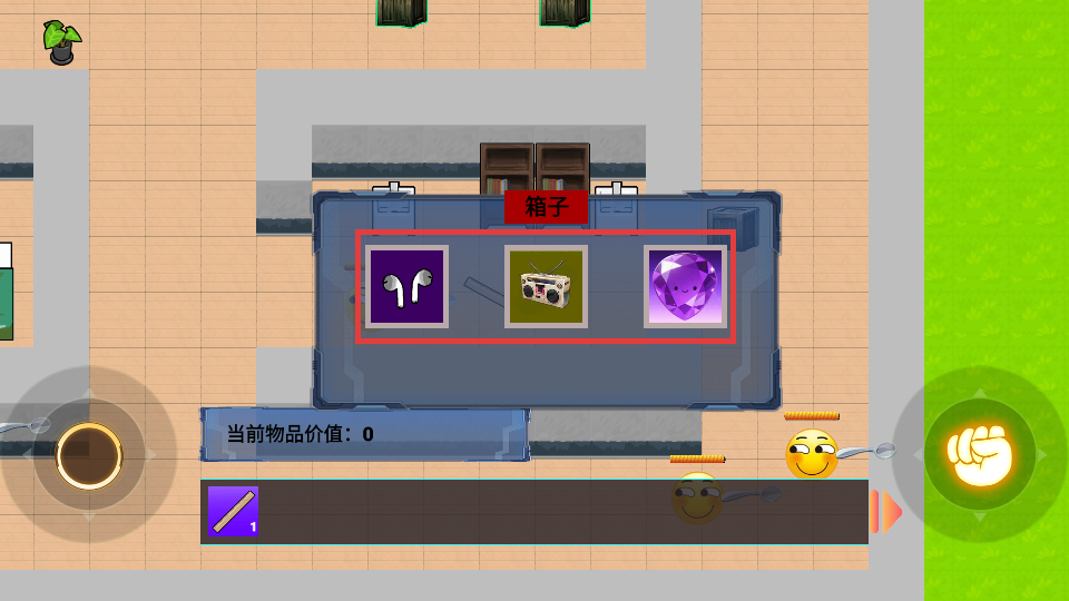 3、战斗时使用【紫色-刀】攻击敌人,收集场景内物品,关注【当前物品价值-0】,留意敌人偷袭,保证生存。