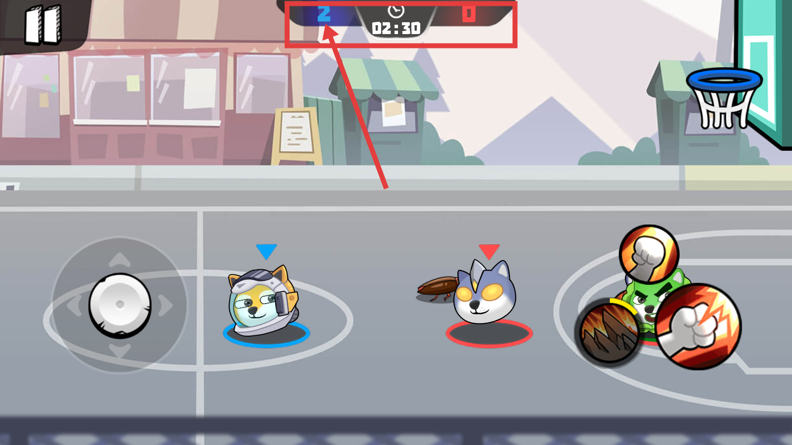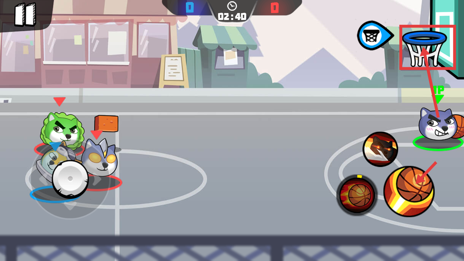 3、拿到篮球后瞄准【篮筐】投篮,成功入网积累分数,同时留意对手动态,保持进攻节奏。