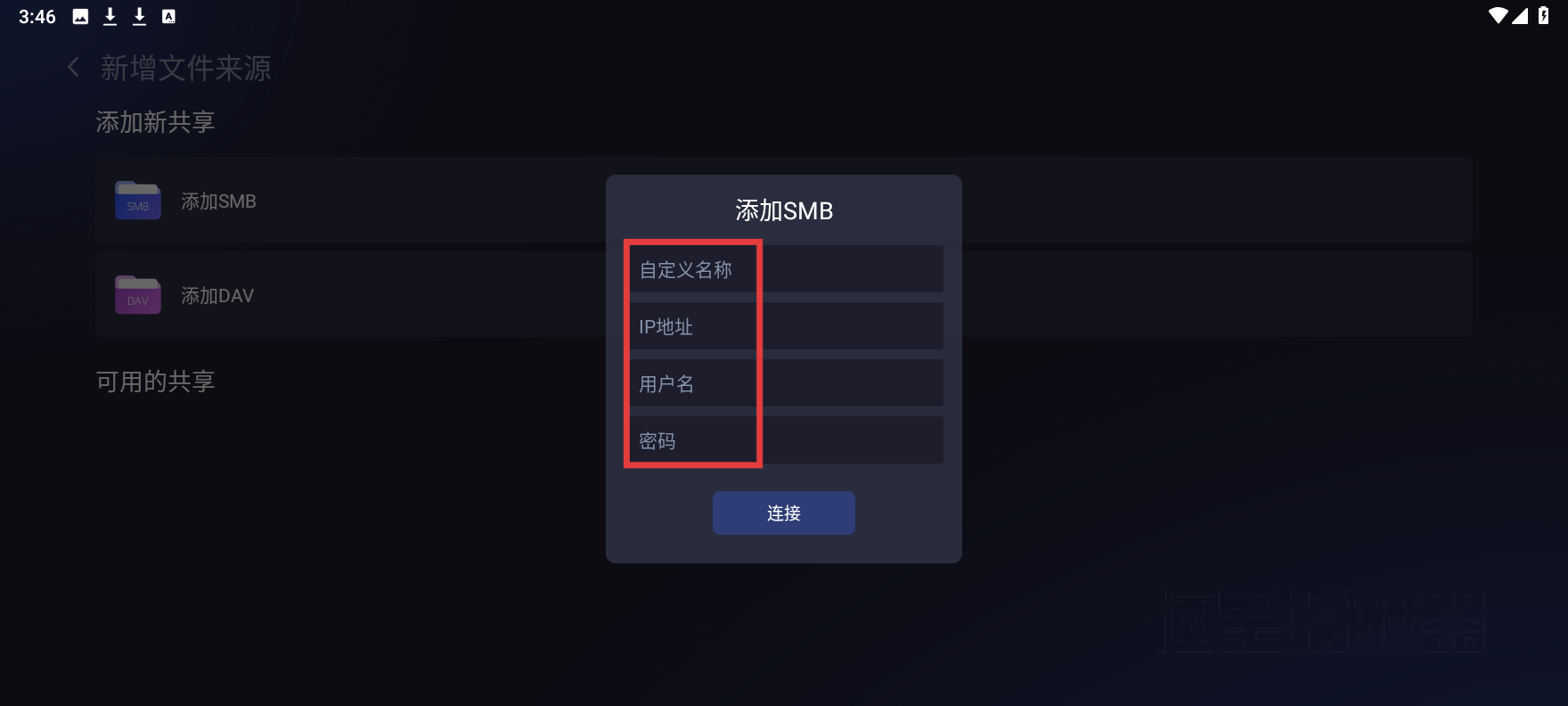 4、在添加 SMB 的弹窗中填写自定义名称、IP 地址、用户名、密码后,点击【连接】,完成 SMB 添加。