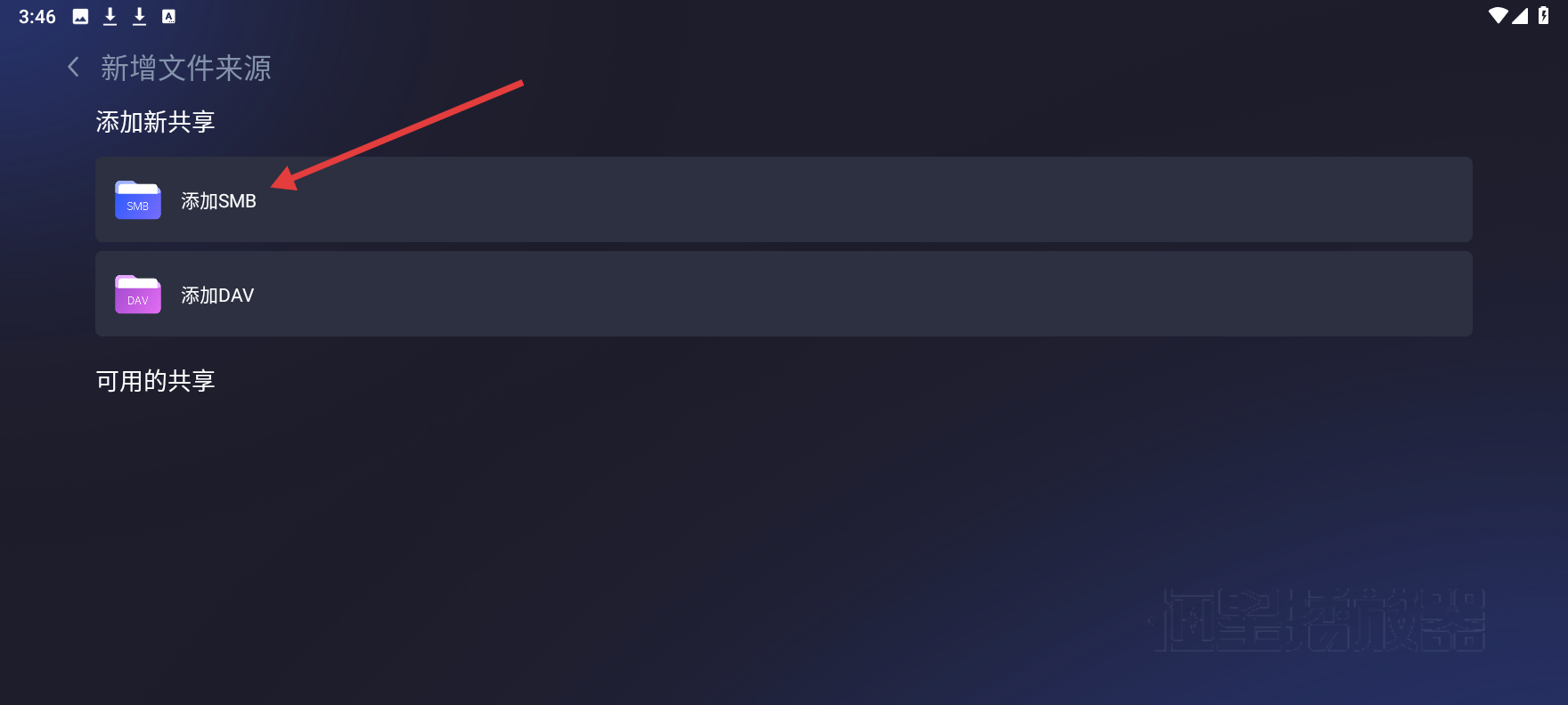 3、在新增文件来源界面点击【添加 SMB】,弹出添加 SMB 的输入框。