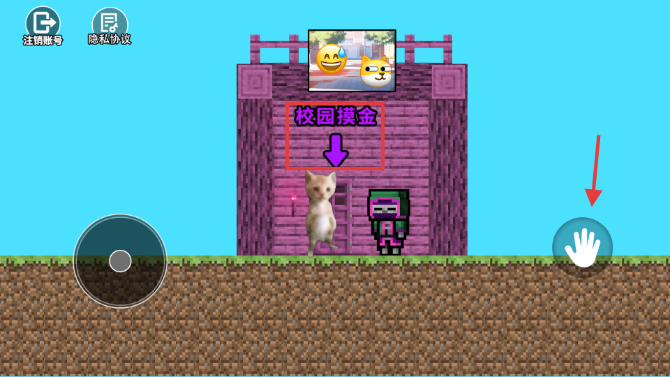 2、用左侧摇杆移动角色,靠近【校园摸金】建筑,点击右侧手掌按钮互动探索。