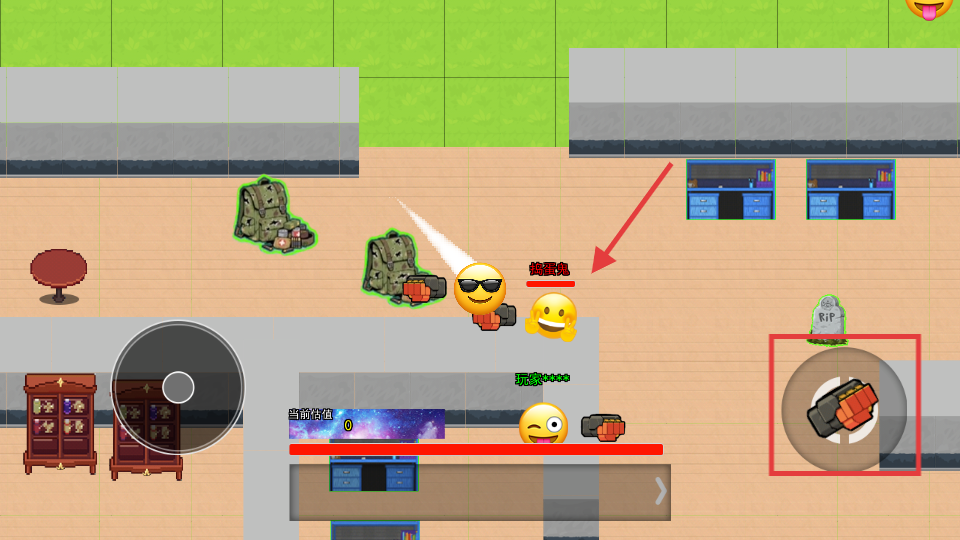 3、瞄准【捣蛋鬼】等敌人,点击右侧武器按钮攻击,争夺敌方物资强化自身。