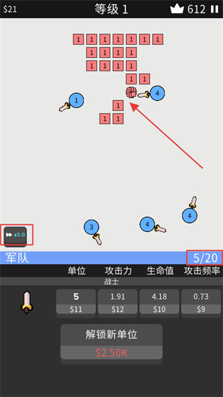 3、战斗时优先攻击聚集的敌人,同时积累资源提升军队单位数量至【5/20】,解锁更强单位以应对更复杂的战斗场景。