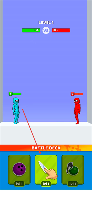 2、在【LEVEL-1】战斗中,从战斗卡组选择【刀-lvl1】道具,发起有效攻击。