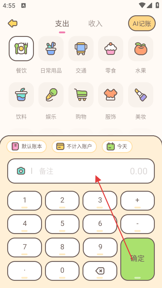 3、在编辑界面,选择支出或收入类型、输入金额、添加备注后点击【确定】,可记录该笔账目。