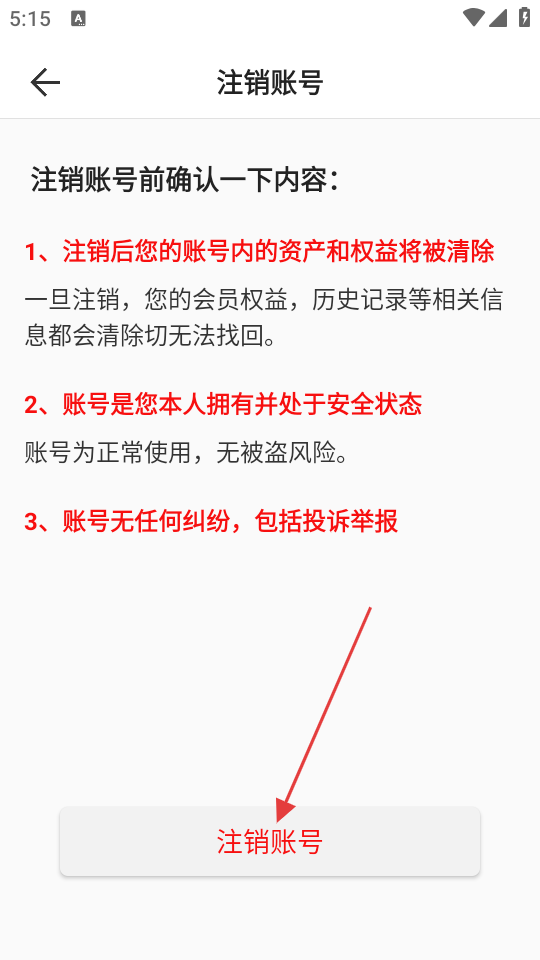 4、在确认界面,阅读注销须知后点击【注销账号】按钮,可提交账号注销申请。
