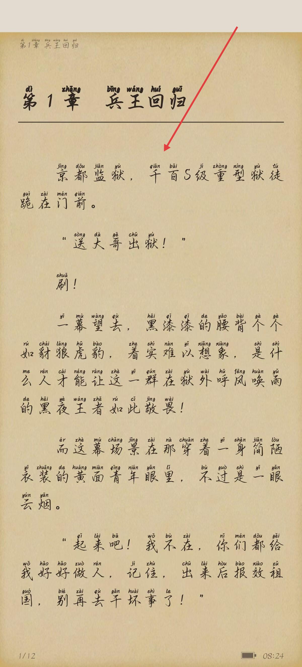 4、在阅读【第1章兵王回归】时,可查看带拼音的章节内容,沉浸式阅读。