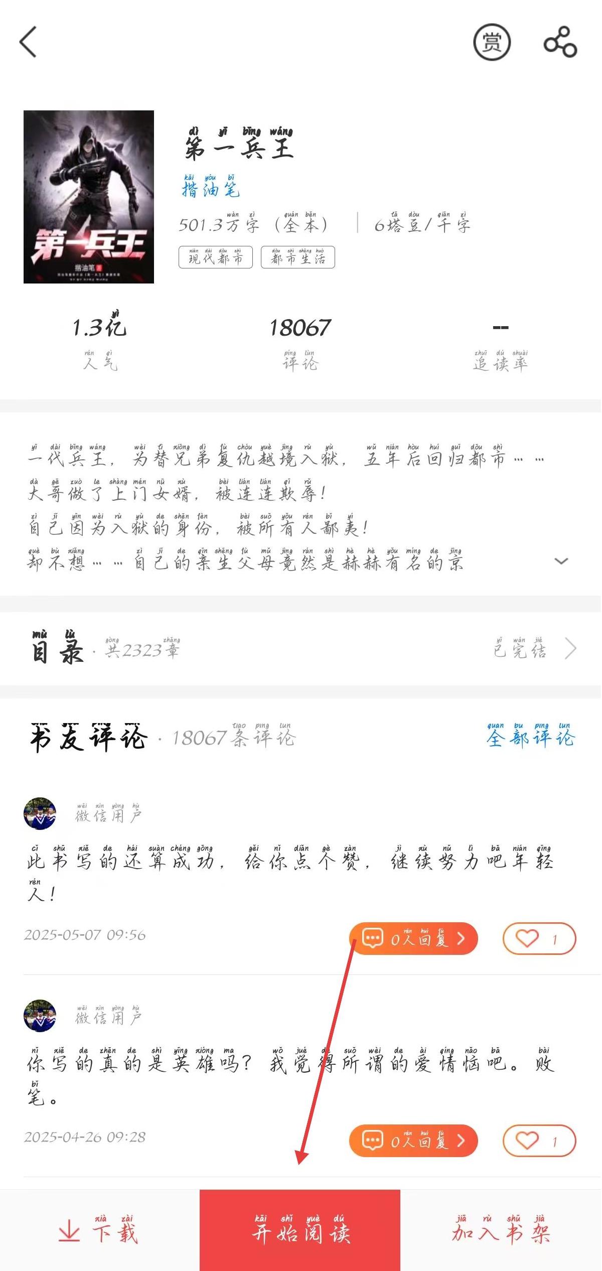 3、进入【第一兵王】书籍详情页后,点击【开始阅读】即可开启阅读之旅。