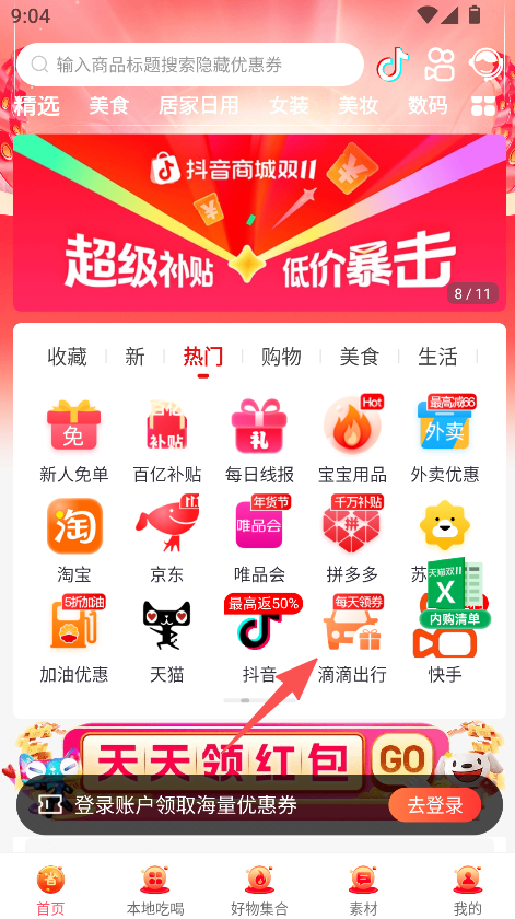 2、切换到热门板块,选择淘宝、京东等电商入口,获取购物优惠。