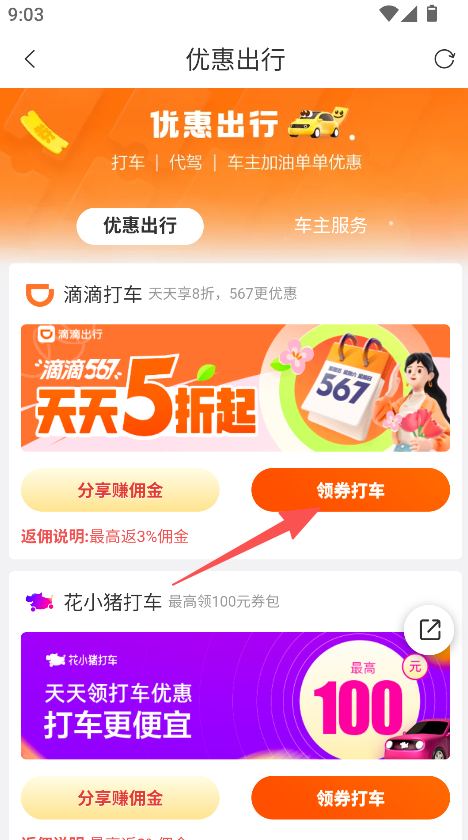 1、打开软件,点击优惠出行,选择滴滴或花小猪打车,点击领券打车,享受出行优惠。