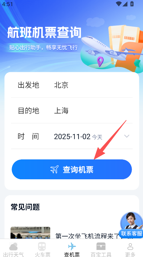 1、打开软件,选择出发地、目的地、时间,点击查询机票。