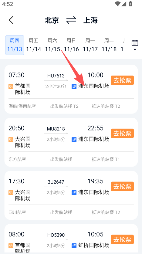 1、航班信息展示全面,每个航班标注出发到达时间、航空公司、航站楼,用户可直观对比选择合适航班。