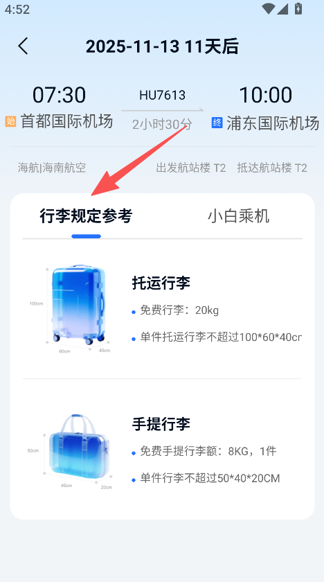 2、整合行李规定参考功能,托运行李、手提行李的免费额度、尺寸要求清晰呈现,让用户提前了解乘机行李规则。