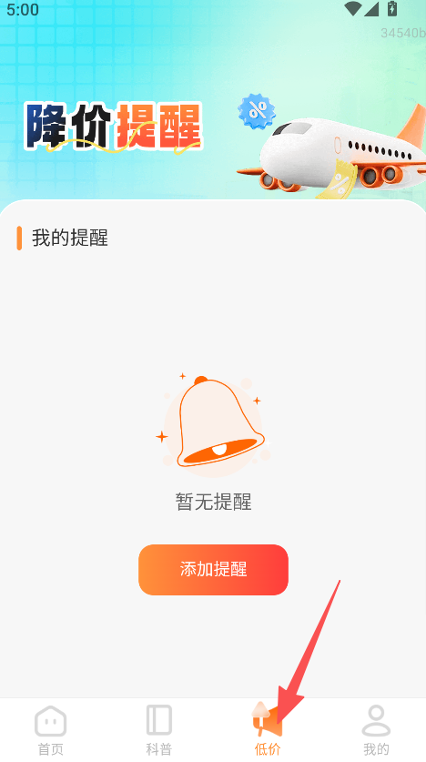 3、界面设计简洁,功能入口清晰,“低价” 板块与添加提醒按钮一目了然,操作体验流畅。