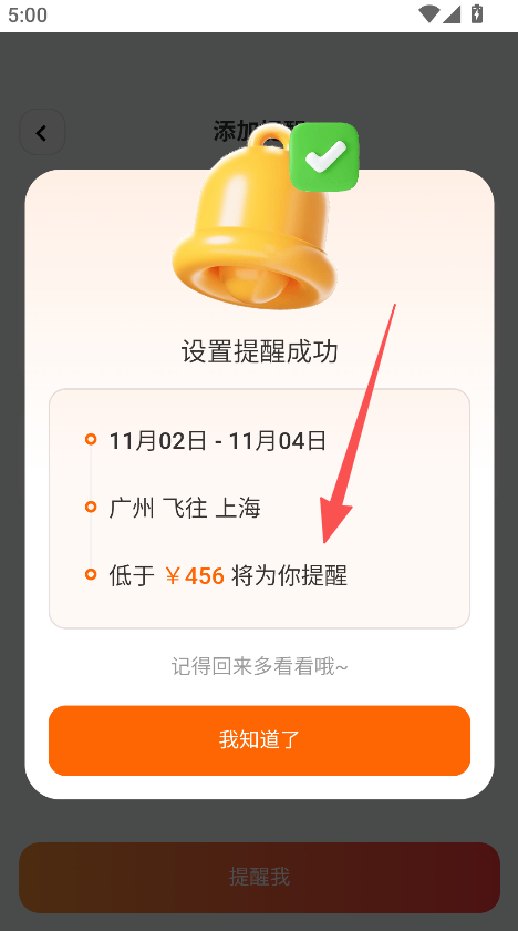 3、完成设置后,软件会在机票价格低于阈值时发送提醒,及时知晓低价机票。