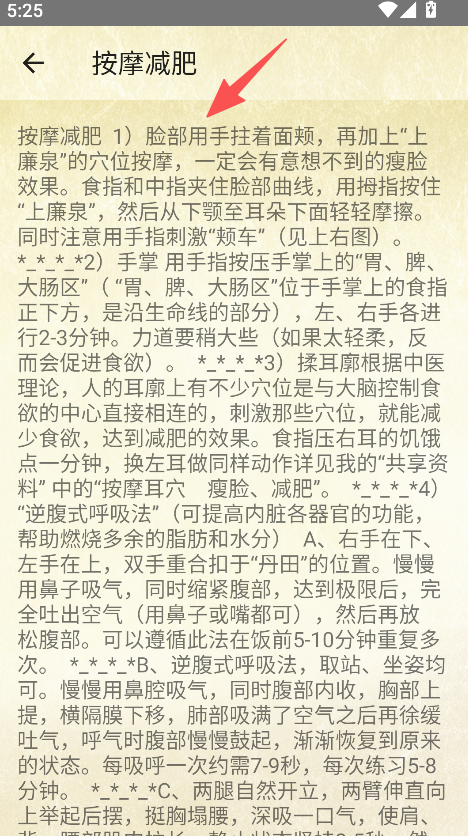 3、内容讲解细致,按摩方法描述具体,如按摩减肥的脸部、手掌操作,便于用户实践。