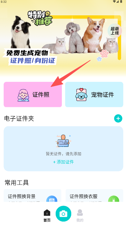 1、在首页点击粉色“证件照”进入证件照功能选择页面。