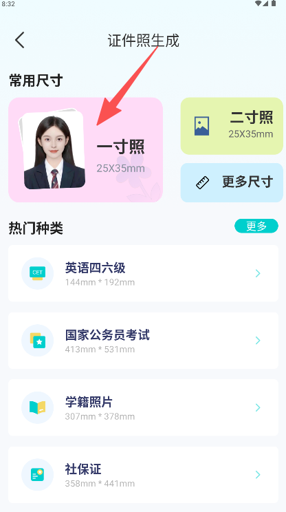 2、在“常用尺寸”区域选择所需规格如“一寸照”拍摄准备页面。