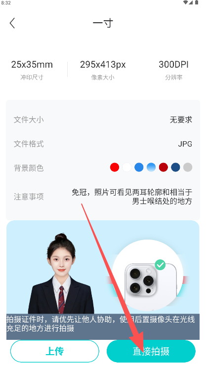 3、在拍摄页面确认参数后点击“直接拍摄”按提示完成证件照拍摄。