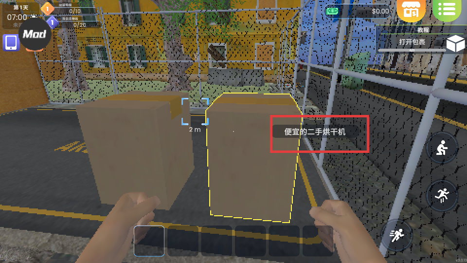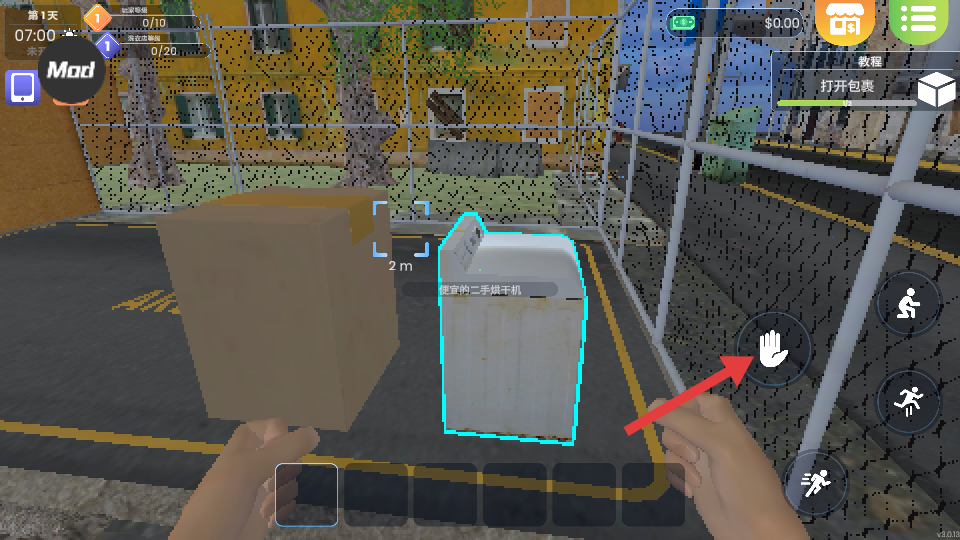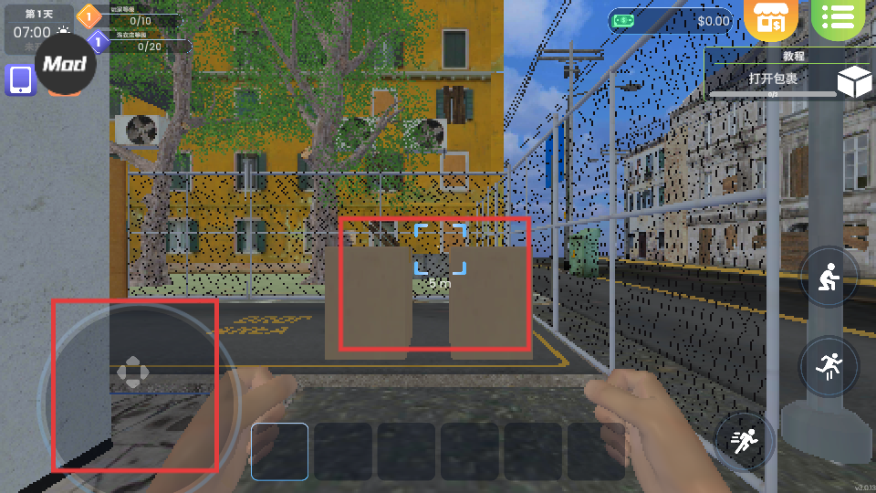 2、通过虚拟摇杆控制角色移动,靠近包裹准备打开。
