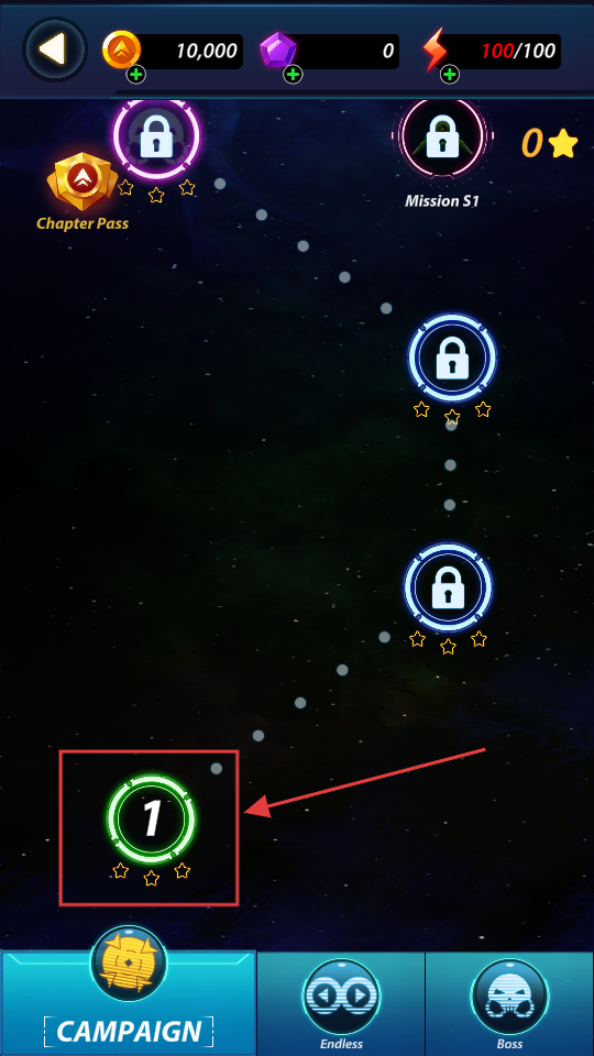 1、点击【1】关卡开启第一关挑战,驾驶战机迎击几何敌机,开启宇宙射击冒险。