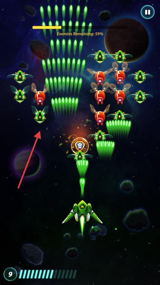2、战斗时优先攻击绿色敌机,关注【EnemiesRemaining-59%】,高效消灭敌机。