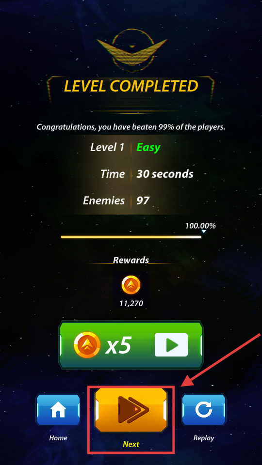 3、通关后点击【Next】按钮进入下一关,继续挑战几何敌机,积累奖励与评价。