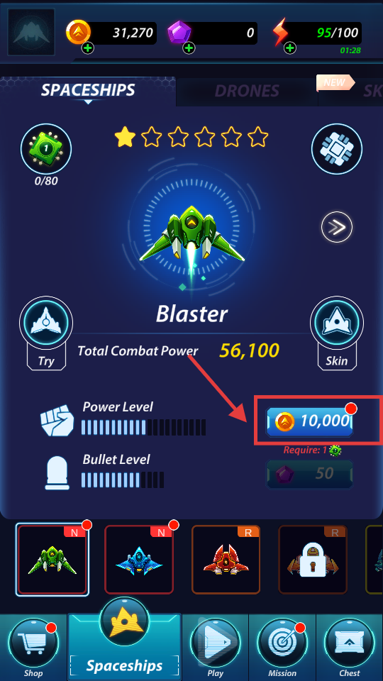 4、在战机界面,用【10,000】金币和芯片升级【PowerLevel】,提升战机战力与射击能力。