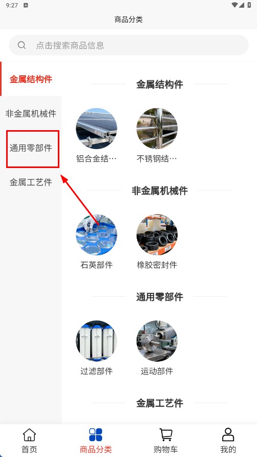 1、在商品分类页,点击左侧例如【通用零部件】,查看该类下商品子类别,精准选品。
