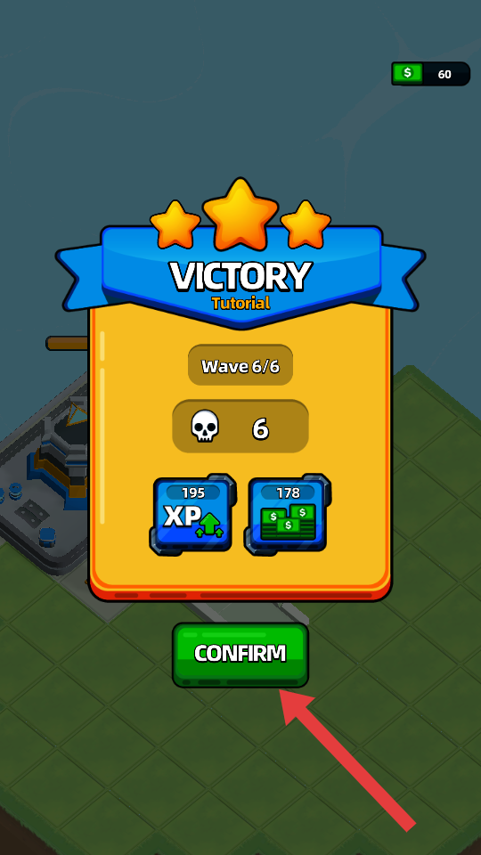 4、成功抵御所有波次敌人后,获取XP和金币奖励,点击【CONFIRM】确认,继续挑战后续关卡。