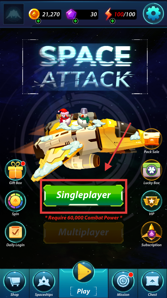 1、若战力达【60-000】【Combat-Power】,点击【Singleplayer】,开启单人飞行射击关卡。